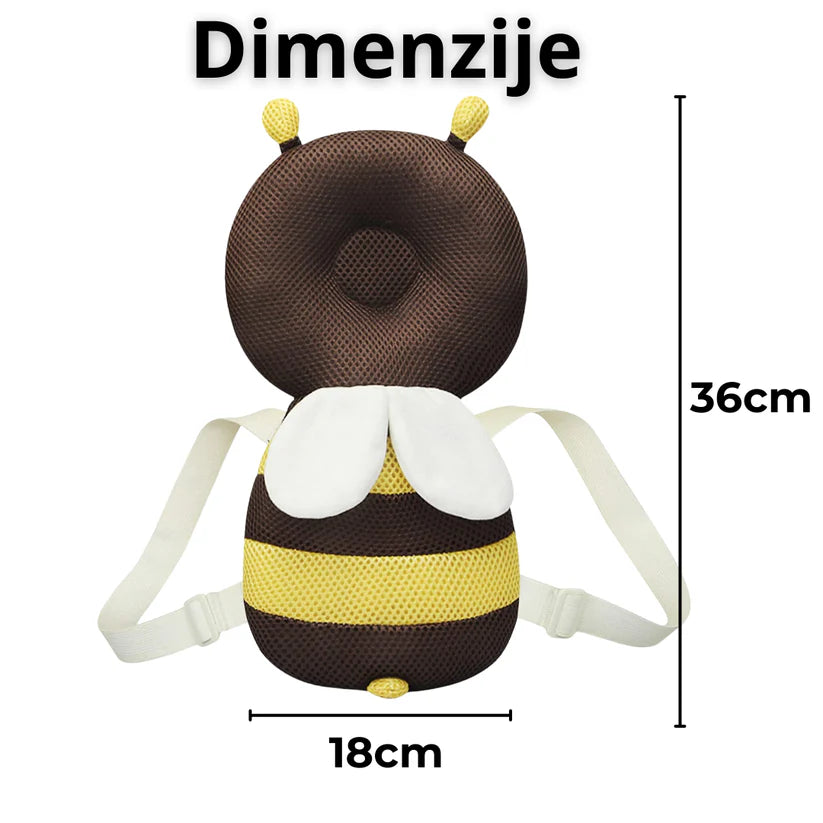 Lagani jastučić u obliku pčelice leži kao ranac na bebinim leđima. Njegov posebni dizajn štiti glavu, vrat i kičmu prilikom pada unazad.