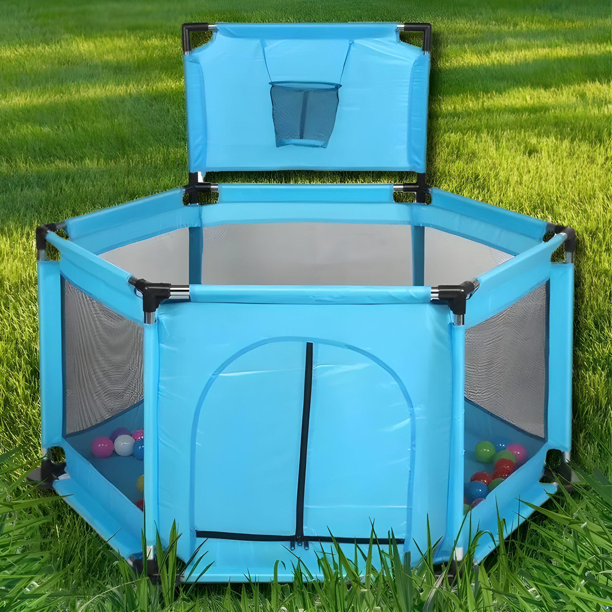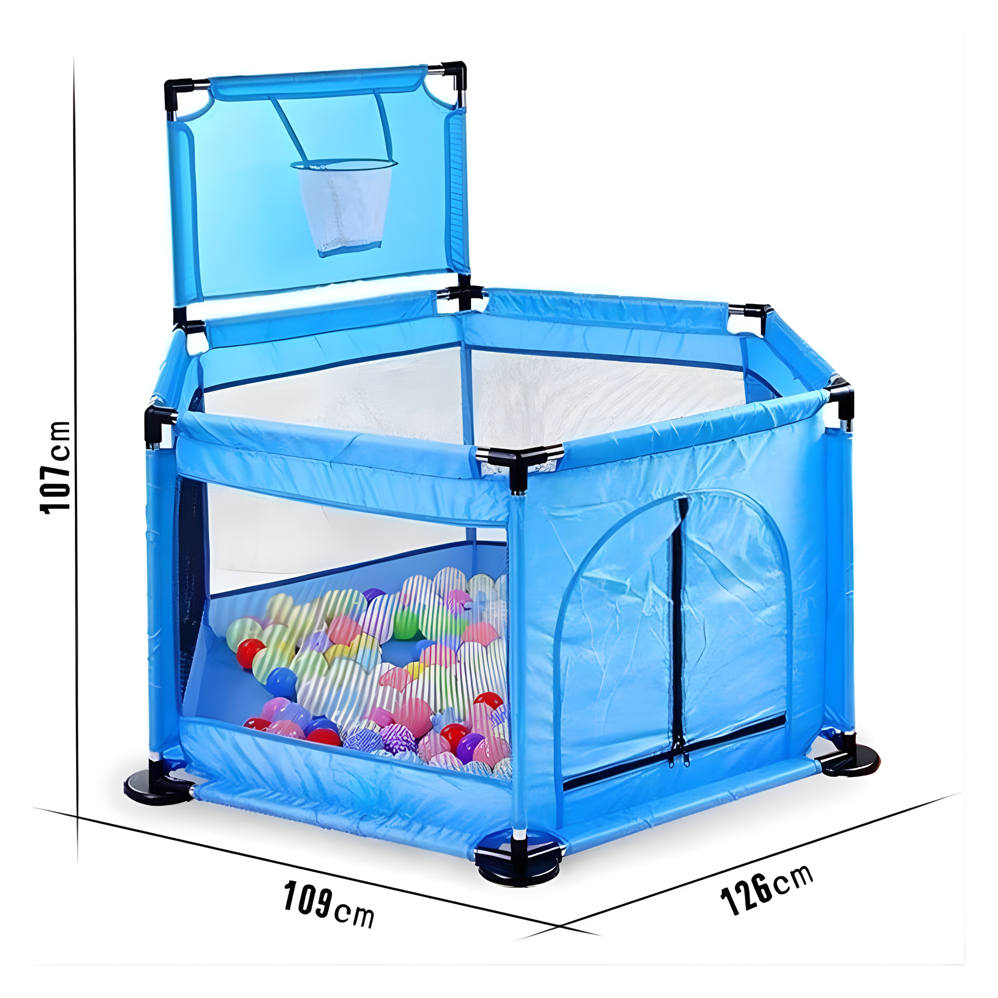Bebi ogradica dolazi sa košem za ubacivanje lopti i 15 šarenih loptica, što je savršeno za razvoj motorike, koordinacije, zabavu i aktivnu igru. Napravljena je od izdržljivih materijala, sa čvrstim cevima i prozračnim mrežicama koje omogućavaju stalnu vidljivost i dobru ventilaciju.