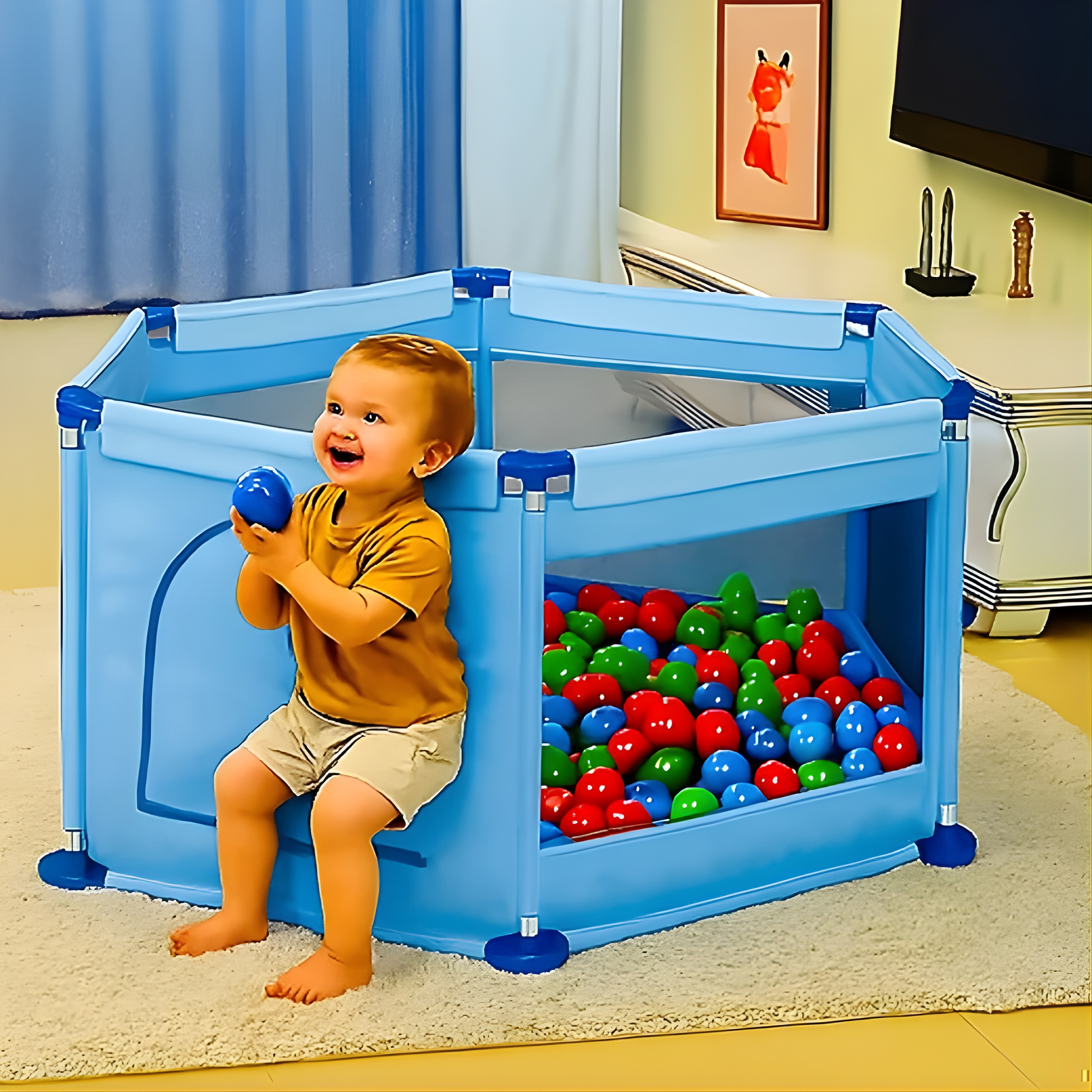 Dodajte ovu praktičnu i zabavnu bebi ogradicu sa košem i lopticama u korpu i obezbedite svom detetu savršen prostor za igru, učenje i bezbedno istraživanje!